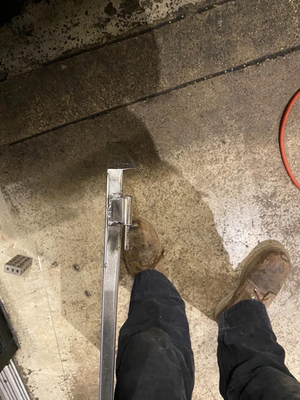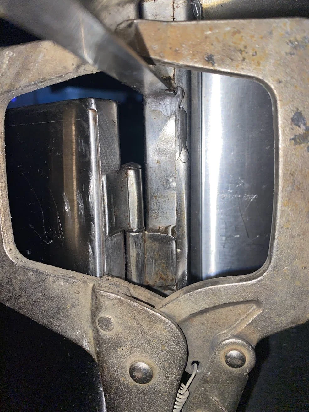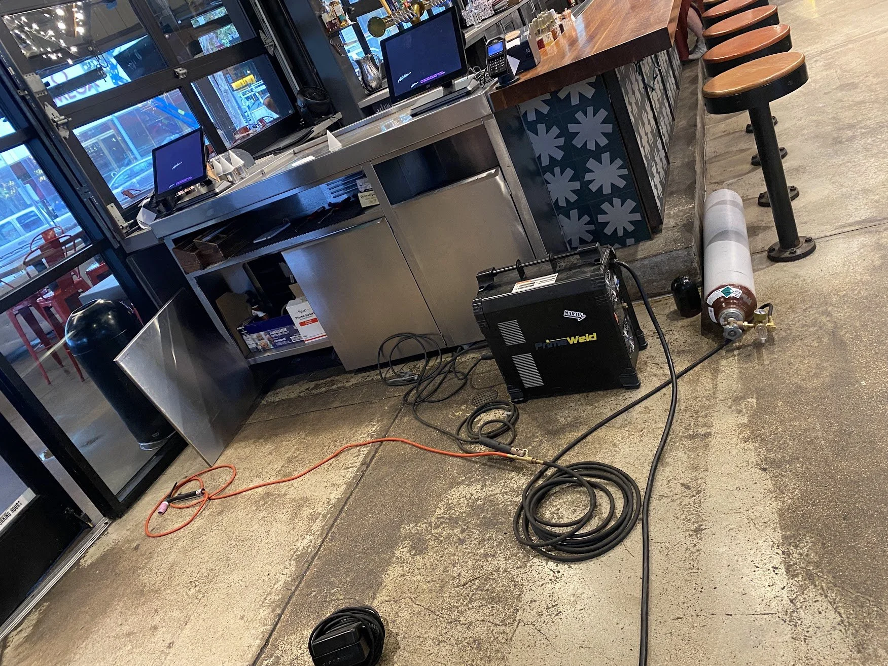 The hinge on this custom made bar cabinet broke off, requiring me to crawl in there and weld it back on.